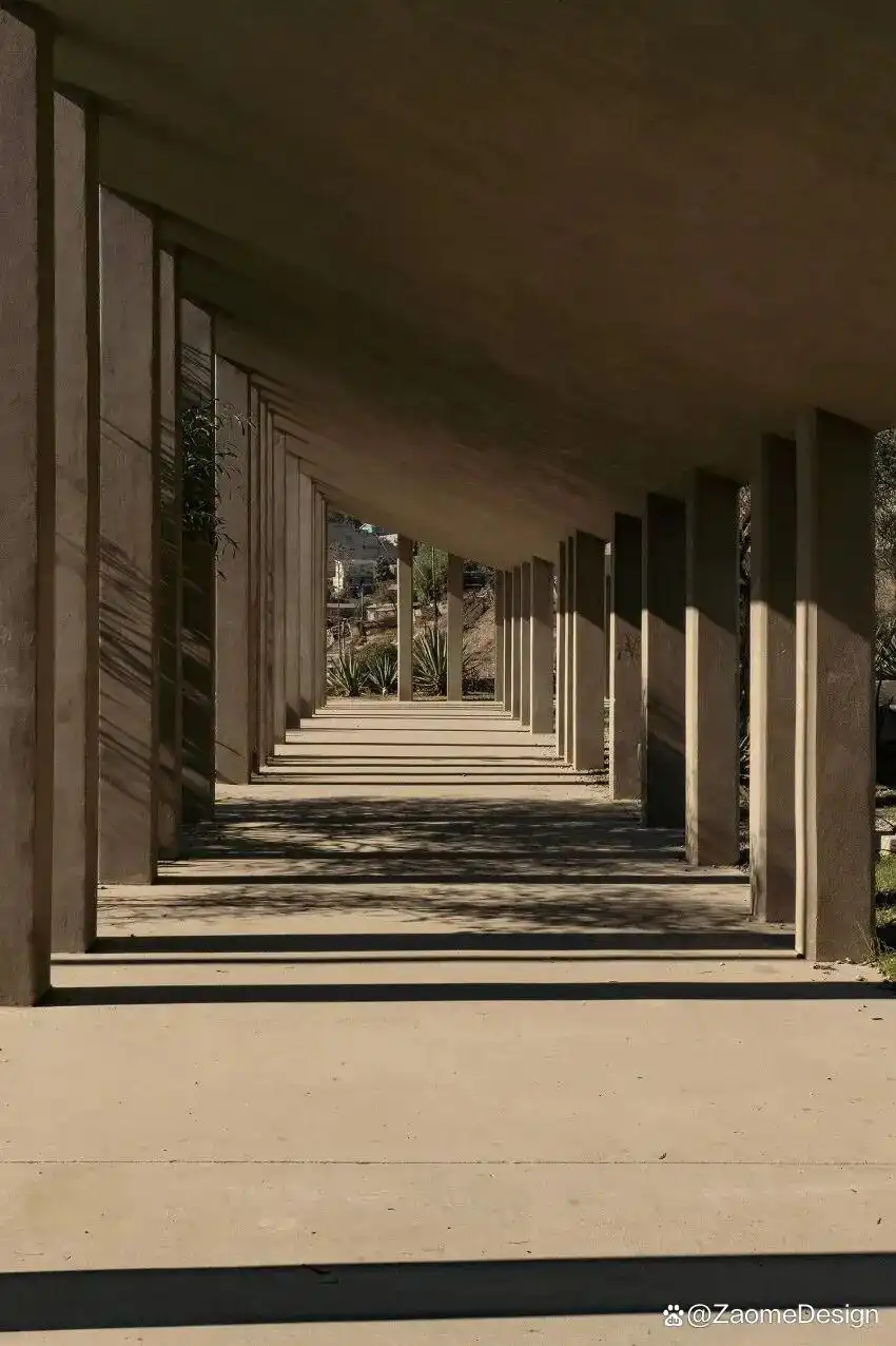 混凝土中使用本地砂石骨料,使其自然呈现出偏米色、接近土壤的色调,无需额外颜料。柱网与体量共同生成类似“条码”的阴影节奏,在降低辐射热的同时,为空间使用提供时间性的秩序。这种几乎零成本的环境策略,在性能与感知层面同时发挥作用。