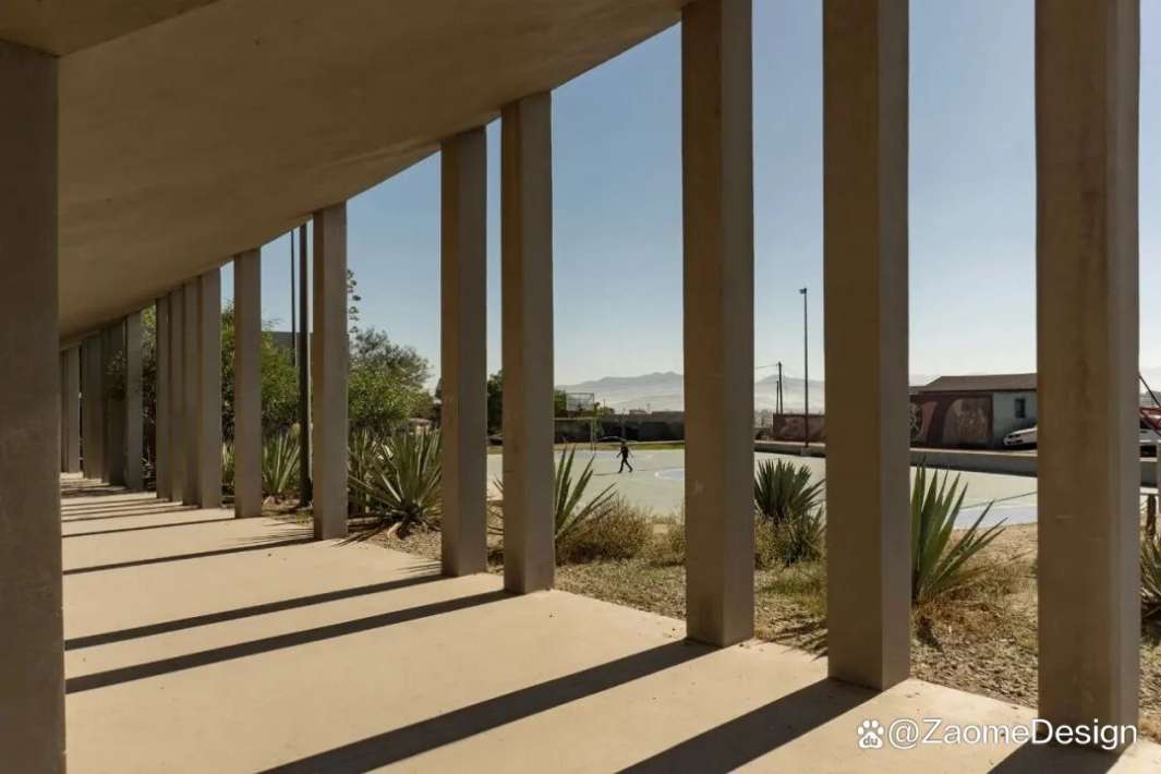 在蒂华纳,高温、强烈日照与压实土壤共同构成了严苛的气候条件。设计团队将气候议题与安全策略并置思考,与其依赖草坪或高维护绿化系统,不如通过结构化遮阴与耐久地面材料来回应环境。项目采用以混凝土、夯实土与碎石为主的“土色系”材料体系,不仅耐热、抑尘、维护成本低,也在色彩上与周边山体形成连续关系,使建筑介入显得克制而稳固。