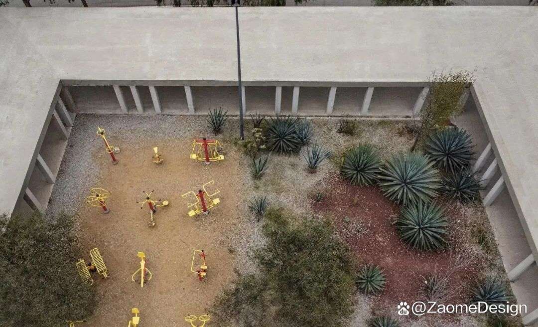 景观设计始终服务于安全与微气候目标。龙舌兰(agave)、索托尔草(sotol)与棕榈被布置于周边,确保视线通透;内部游乐区则以轻冠乔木提供斑驳阴影。唯一形成浓荫的,是场地边缘原有的成熟乔木,它们在不制造隐蔽空间的前提下,强化了“城市绿洲”的感知。