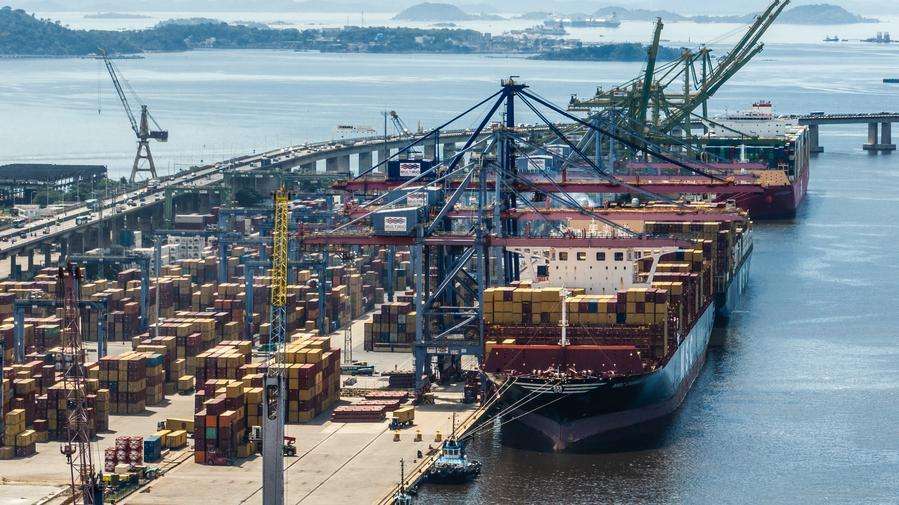 Vista aérea del3de abril de2025de la actividad naviera en un puerto,en Río de Janeiro,Brasil.(Xinhua/Wang Tiancong)
