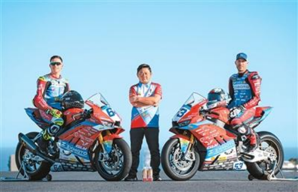 “张雪机车”创始人张雪(中)和参加世界超级摩托车锦标赛的车手瓦伦丁·德比斯(右)、费德里科·卡利卡苏洛合影。