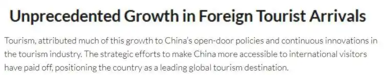 文章最后说,展望未来,中国旅游业的前景更加光明。政策开放、技术创新与深度文化融合的有机结合,使中国成为全球旅游业的领军者。通过持续拥抱新技术、丰富文化产品供给、打造无缝衔接的旅行体验,中国将稳居国际游客最向往的旅游目的地榜单的前列。