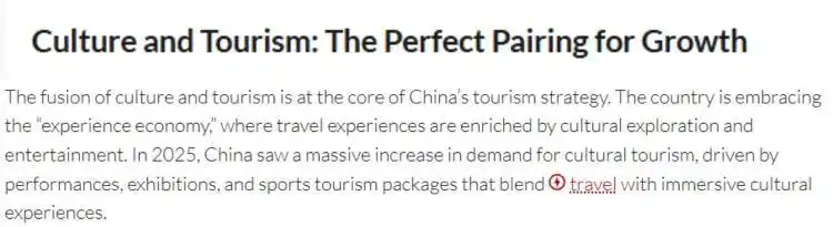 文章认为,文旅深度融合是中国旅游发展战略的核心。当前,中国正积极拥抱“体验经济”,通过文化探索与娱乐休闲为旅行体验注入更丰富的内涵。在文艺演出、主题展览以及将旅行与沉浸式文化体验相结合的体育旅游套餐的推动下,中国文化旅游需求大幅增长。