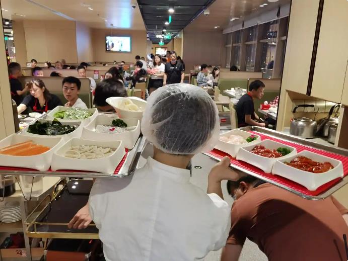 海底捞火锅成都世豪广场店员工在传送顾客点的食材。新华社