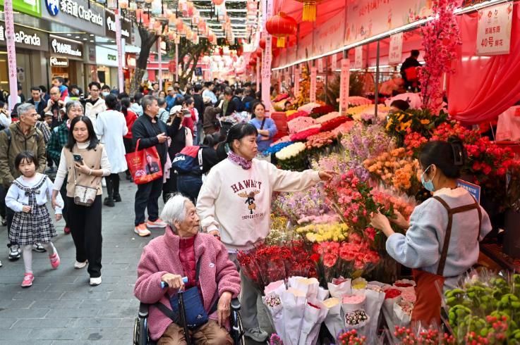 1月25日,广东广州,已有百年历史的西湖花市开市迎客。图为市民在西湖花市选购花卉。中新社