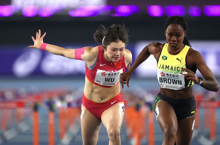 3月23日,在2025南京世界田联室内锦标赛女子60米栏预赛中,中国选手吴艳妮(左)以8秒05晋级半决赛,并跑出个人最好成绩。中新社