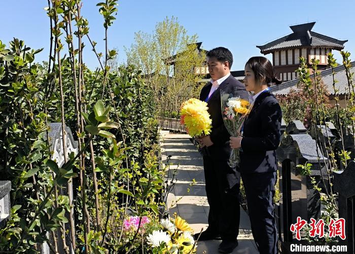 河北石家庄大峪山生命纪念园以“绿色殡葬”为核心理念。图为4月2日,工作人员代客祭扫。中新网