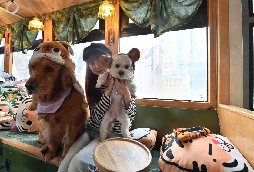 近日,长春54路文旅东北虎专列专为宠物主人们推出携带宠物乘车的专属服务。图为宠物和主人在长春的车厢拍照留念。中新社