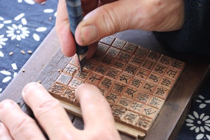 2025年3月,浙江瑞安东源村,手艺人用刻刀雕刻木活字。中新社