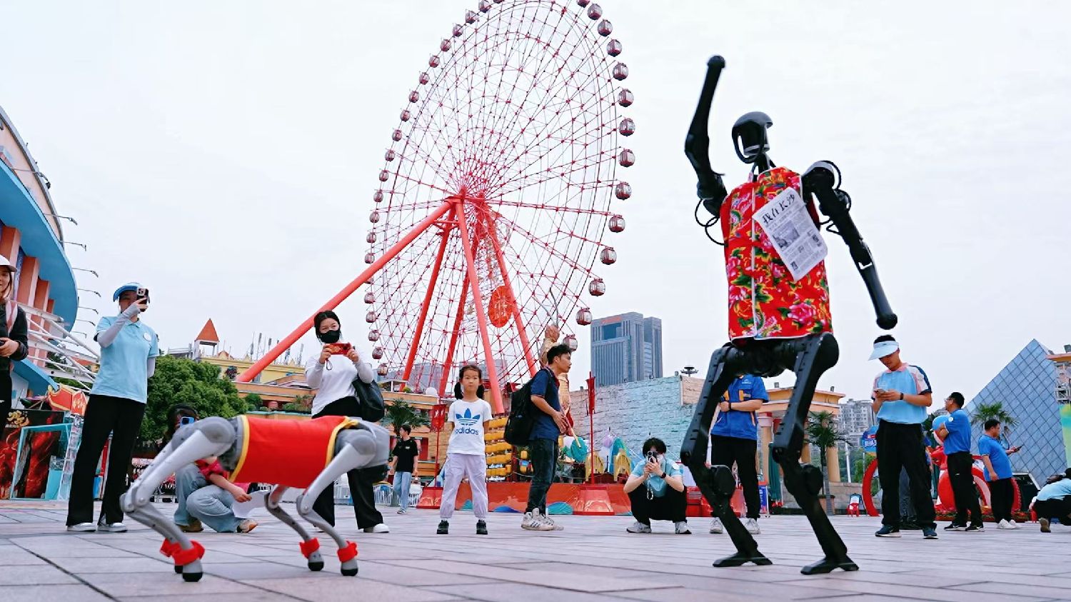 “五一”小长假首日,长沙世界之窗引入机器人、机器狗与游客互动。中新社