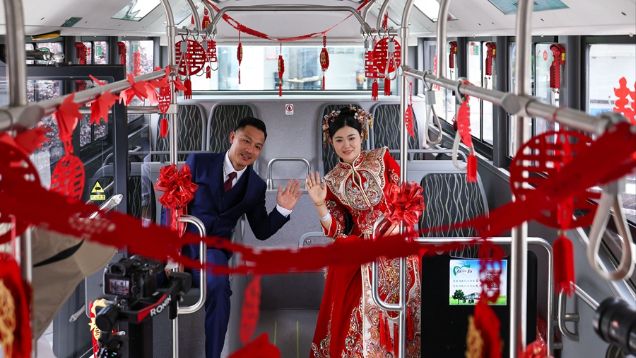 4月30日,“爱情巴士”搭载着新郎新娘前往浙江诸暨市同山镇唐仁村祠堂进行婚礼仪式。新华社