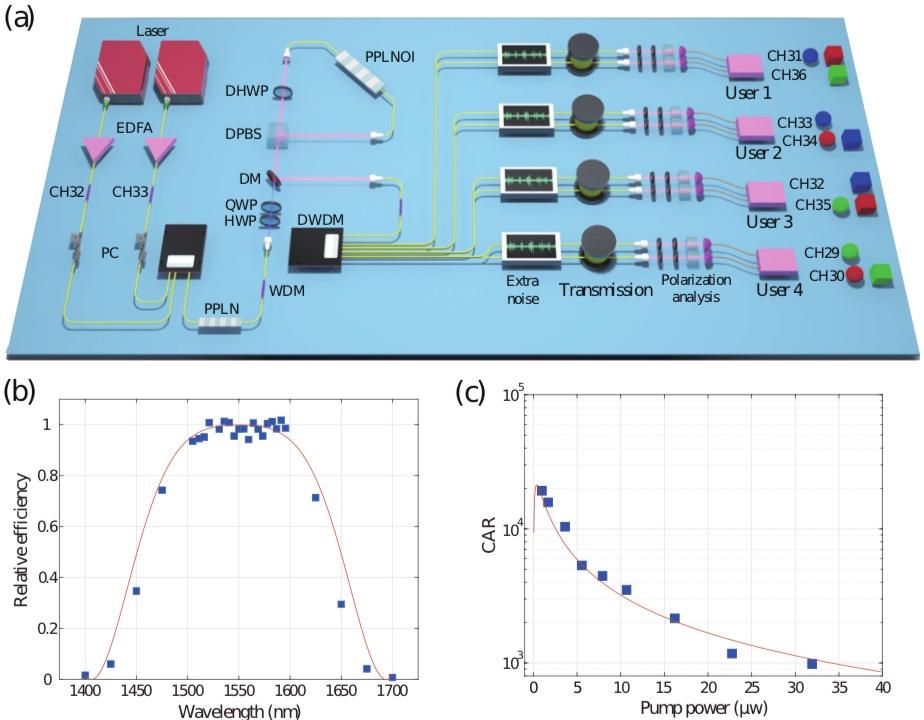 在最新研究中,科研人员创新性地采用双泵浦光参量下转换技术,构建起具有高抗干扰能力的量子纠缠分发系统。实验结果显示,通信后各节点间共享量子态保真度仍保持在85%以上,验证了该方案在长距离通信中的可靠性。经300公里传输后到达接受节点的光子对数仍达300至400Hz(赫兹),这意味着经过编码后,理论通信速率可达每秒数比特。