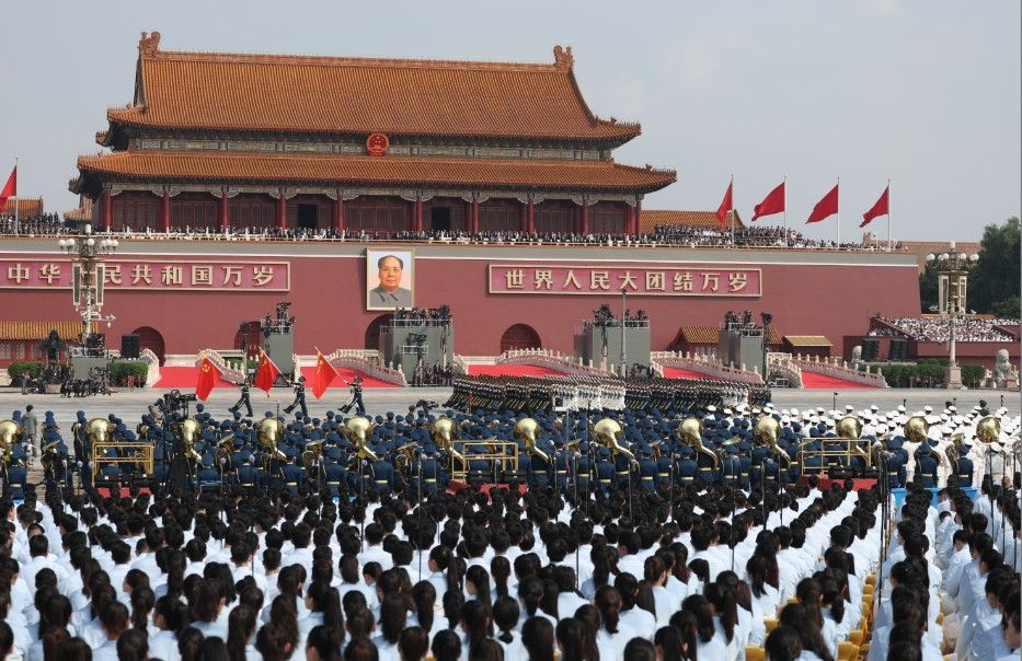 徒步方队、战旗方队、装备方队、空中梯队依次通过天安门广场。中国军队军事力量结构新布局在阅兵中首次集中展示。