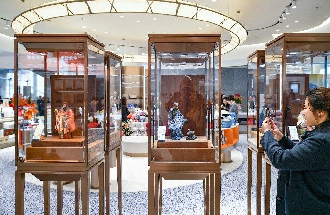 11月28日,天津首家市内免税店,顾客在“泥人张”彩塑展示柜前打卡拍照。中新社
