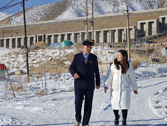 图为家住萨尔达坂乡哈那提·努尔哈孜(左)向村里的年轻人介绍牧民转场的变化,背后就是26日通车的乌尉高速公路。中新社