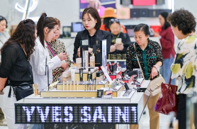 18日,顾客在cdf海南海口国际免税城选购化妆品。海南自贸港封关首月,离岛免税市场火爆。中新社