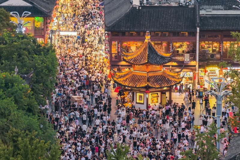 2025年10月5日,游客们在江苏南京夫子庙景区内旅游。中新社