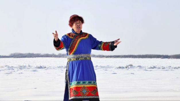 2025年12月25日,吴宝臣在黑龙江边传唱伊玛堪。中新社