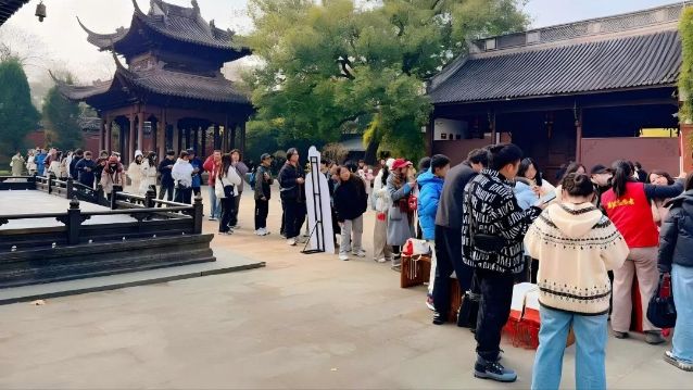 游客线下打卡《太平年》中提及的浙江杭州钱王祠。电视剧《太平年》官方微博账号