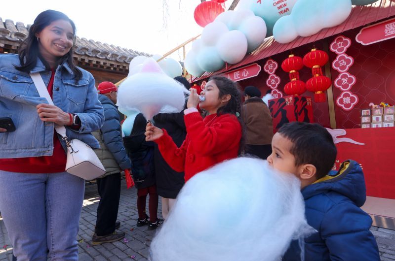 2月17日,农历正月初一,“会馆大开箱——2026前门东区新春非遗奇珍妙会”活动在北京前门东区三里河区域启幕。图为海外游客品尝棉花糖。中新社