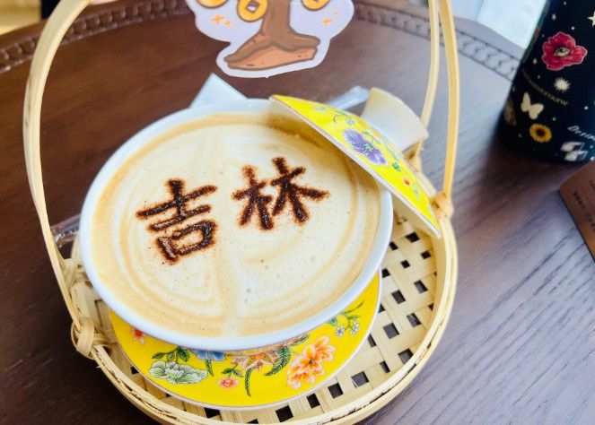 展览馆一角,开设了一间咖啡厅。工作人员向周樾乔推荐“盖碗咖啡”:用中式茶具盛装,奶泡上拉花写出“吉林”二字。她端起盖碗品尝,笑称“味道不错,更重要的是形式很有特色”。