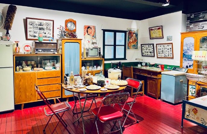 23日,位于吉林市河南街的新兴园饺子馆,馆内吉林史话博物馆展出的“吉林制造”与曾经的生活场景。中新社