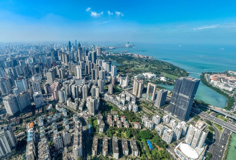 2025年12月18日,海南自由贸易港正式启动全岛封关。图为2025年12月17日拍摄的海南省海口市滨海大道楼宇。中新社