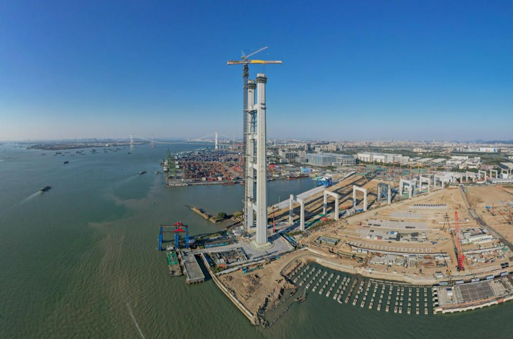 1月2日,广东东莞,狮子洋大桥东主塔建设中。狮子洋通道是珠江口首条双层复合跨江公路通道,全长约35公里,上下双层共16车道,连接广州南沙区和东莞沙田、虎门两镇。建成通车后将为粤港澳大湾区融合发展开辟新的重要通道。中新社