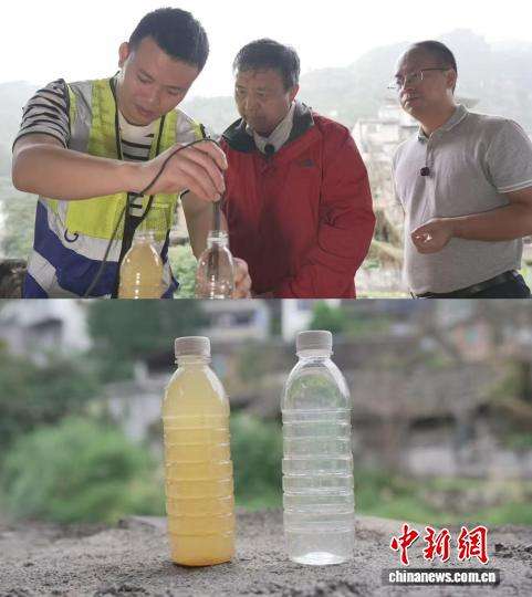 第二张照片拍摄于乌蒙山深处。照片里,九三学社四川省委会副主委、成都理工大学校长许强正和专家研究两瓶水——一瓶浑浊,一瓶清澈。