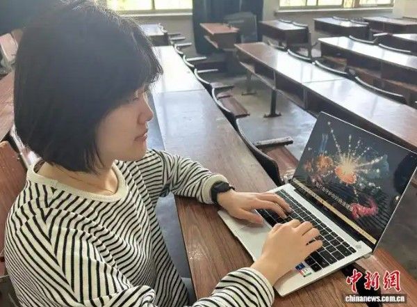 山东师范大学学生周一鸣在学校剪辑制作AI科普剧《肠道里的三国杀》。中新网