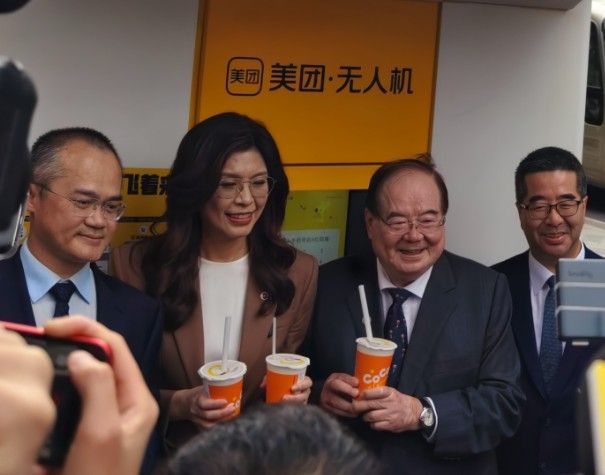 8日,中国国民党主席郑丽文(左二)一行,在美团上海总部体验无人机外卖,点了珍珠奶茶。中新社
