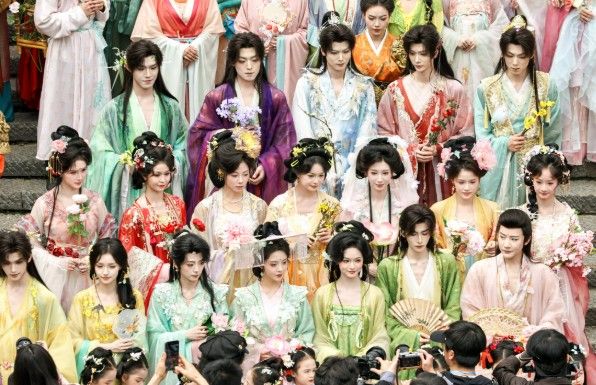 3月28日,湖北武汉,汉服爱好者巡游后合影。当日,第七届汉口里花朝节在武汉园博园正式启幕,现场开展祭花神、汉服巡游、古风展演及民俗体验等内容。中新社