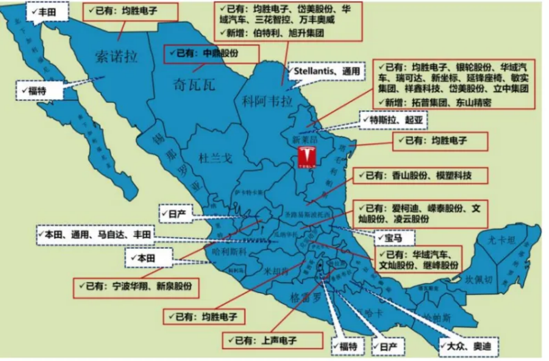 抛开特斯拉墨西哥工厂所带来的影响,对于中国供应链企业来说,墨西哥本就有不小的吸引力,这从一些企业早前的布局中就能看出。截至目前,均胜电子、拓普集团、旭升集团、伯特利、金力永磁、三花智控、立中集团、东山精密、祥鑫科技、岱美股份、银轮股份、上声电子等汽车供应链企业已在墨西哥实现量产。