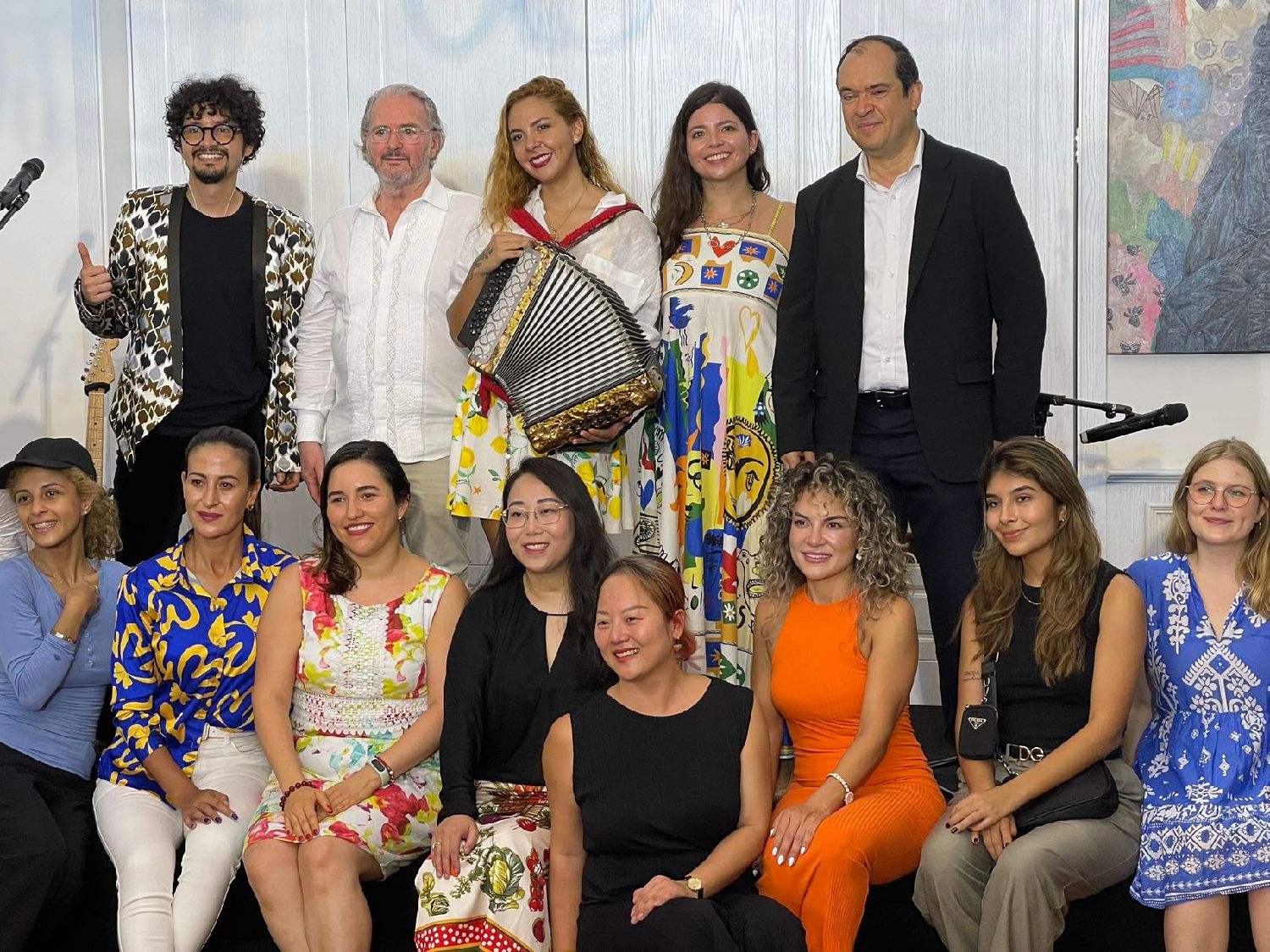 Diana Burco, cantante, compositora y acordeonista colombiana, deleitó a su público en el salón principal de la Embajada de Colombia, Beijing, 29 de julio del 2024.(Foto:YAC)
