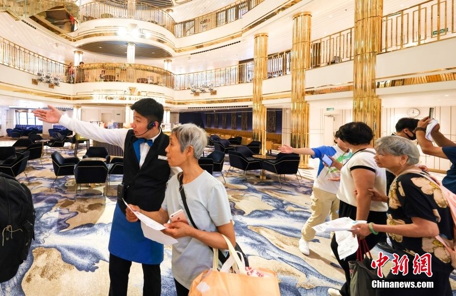 “爱达·魔都号”大厅的船员为登船旅客做指引。中新社