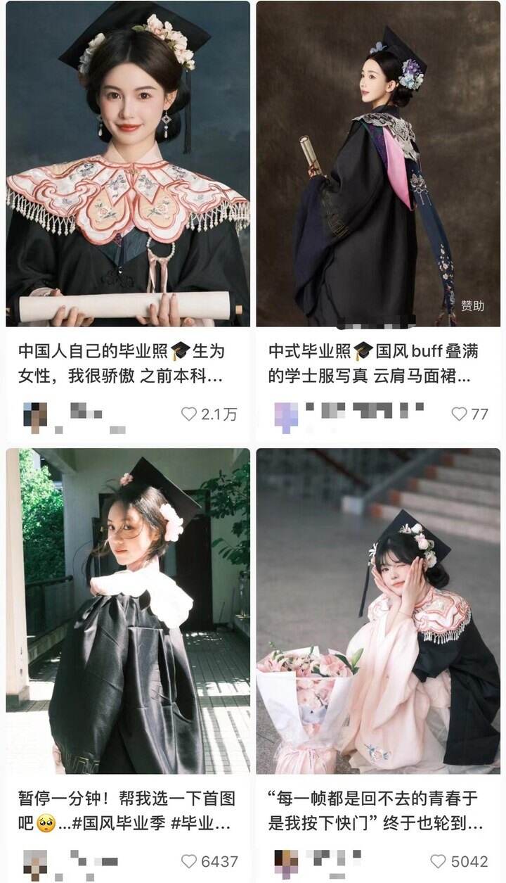 受到今年毕业季的影响,云肩、长衫、簪花学士帽等中国国风毕业照必备单品在网购平台上表现突出。来自淘宝的数据显示,簪花学士帽搜索同比增长658%,云肩搜索同比增长97%,汉服长衫搜索同比增长130%。
