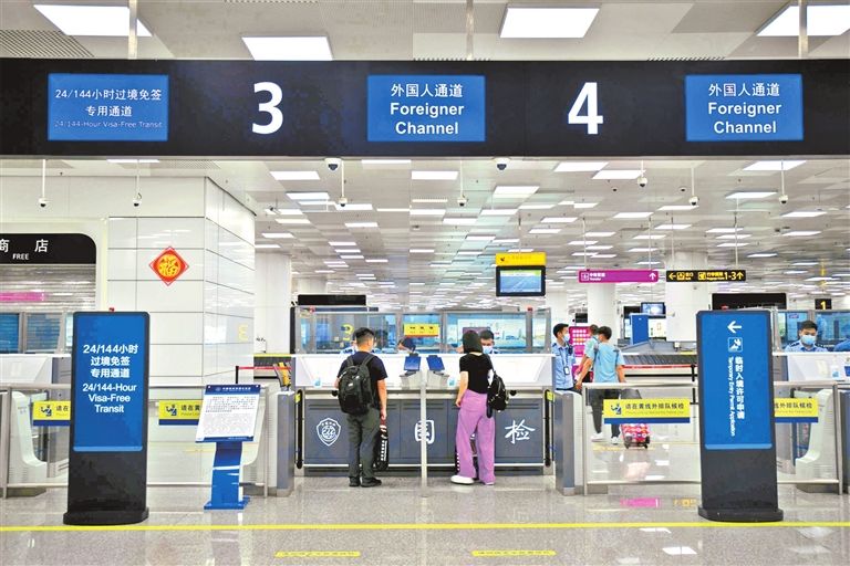 郑州出入境边检站开设144小时过境免签手续办理区域及通道。郑州《河南日报》
