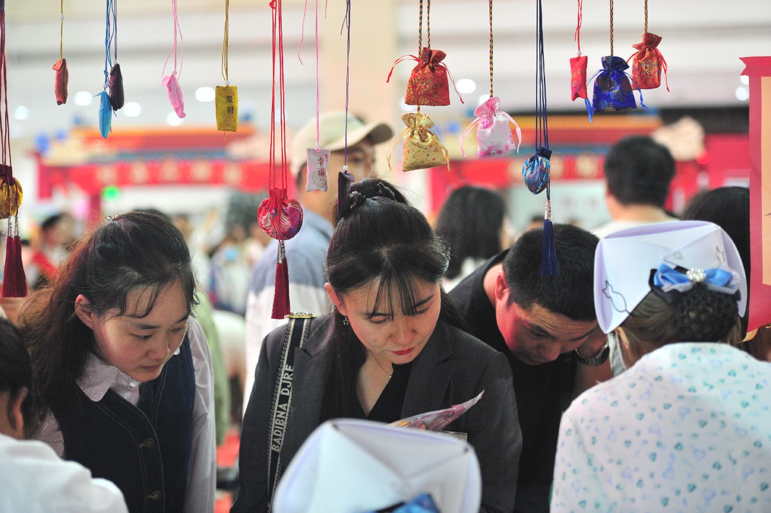9月6日,年轻消费者在吉林长春的中医药文化夜市上选购中药香囊。中新社